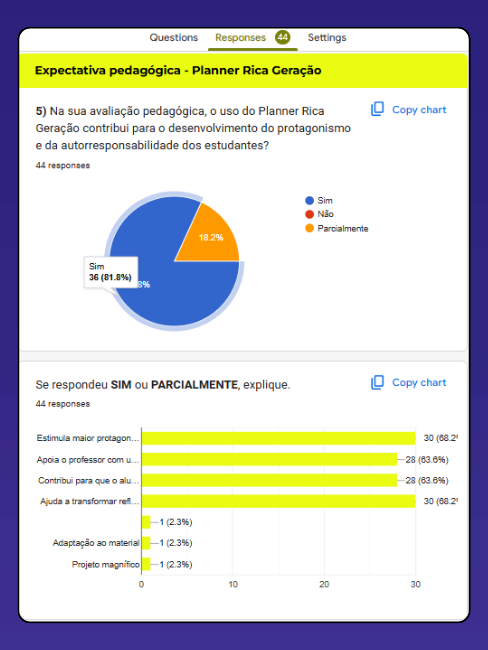 O diagnóstico foi consistente: 100% afirmaram que os alunos não conseguem se organizar plenamente para cumprir prazos. Para 83,3%, a principal causa é a falta de planejamento; 47,6% apontaram ausência de ensino estruturado sobre organização. Quando o tema é a construção do futuro, 97,6% indicaram que os estudantes ainda não demonstram maturidade suficiente para refletir com profundidade, especialmente pela dificuldade de pensar a longo prazo e de relacionar estudo e carreira.